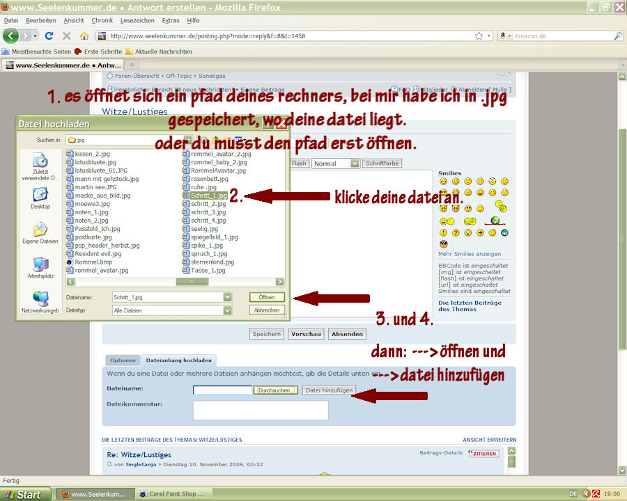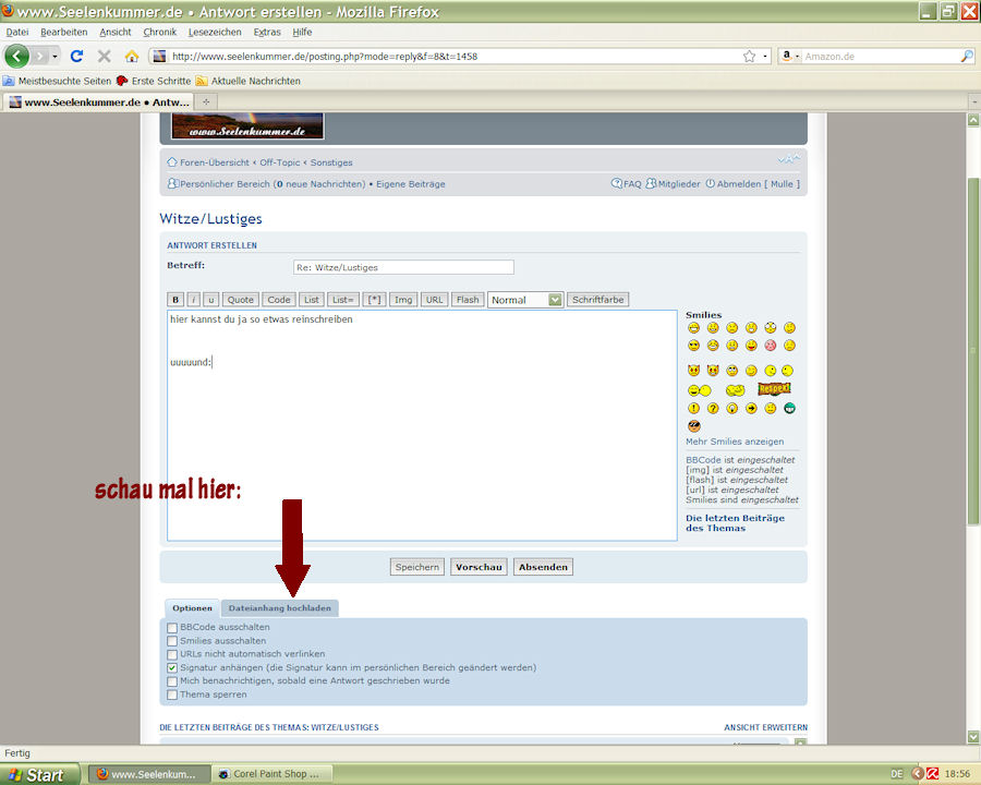 nun scroll die ganze seite runter und dann findest du die option ---> dateianhang hochladen. diese öffnest du, suchst die datei in deinem verzeichnes, wo du sie abgelgt hast, fügst sie ein, lädst sie hoch und kannst sie dann auch noch auf die option ---> im beitrag einfügen klicken. das müsste es sein.